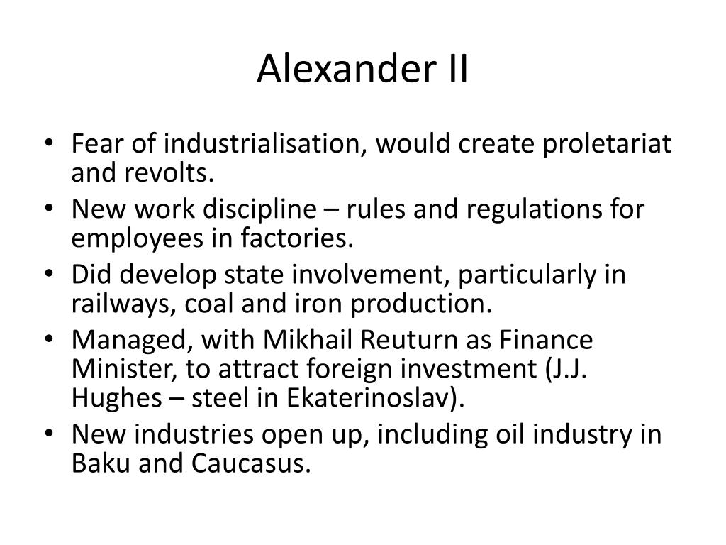 Alexander II • Fear of industrialisation, would create proletariat and revolts. • New work discipline – rules and regulations for employees in factories. • Did develop state involvement, particularly in railways, coal and iron production. • Managed, with Mikhail Reuturn as Finance Minister, to attract foreign investment (J.J. Hughes – steel in Ekaterinoslav). • New industries open up, including oil industry in Baku and Caucasus.