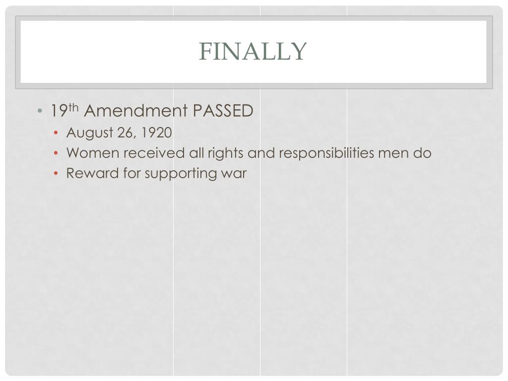 FINALLY • 19th Amendment PASSED • August 26, 1920 • Women received all rights and responsibilities men do • Reward for supporting war