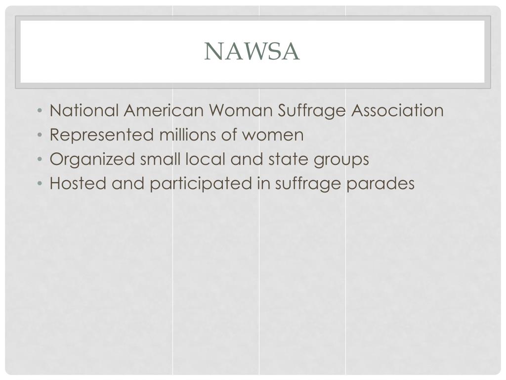 NAWSA • National American Woman Suffrage Association • Represented millions of women • Organized small local and state groups • Hosted and participated in suffrage parades