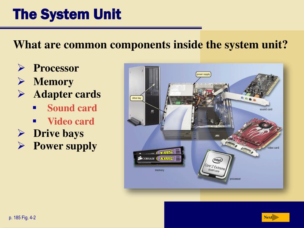 The System Unit Next What are common components inside the system unit? • Processor • Memory • Adaptercards • Sound card • Video card • Drive bays • Powersupply p. 185 Fig. 4-2