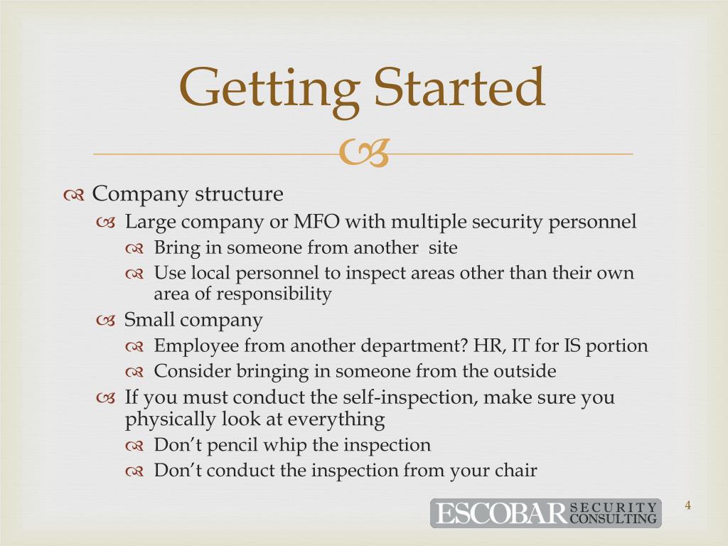 Getting Started • Company structure • Large company or MFO with multiple security personnel • Bring in someone from another site • Use local personnel to inspect areas other than their own area of responsibility • Small company • Employee from another department? HR, IT for IS portion • Consider bringing in someone from the outside • If you must conduct the self-inspection, make sure you physically look at everything • Don’t pencil whip the inspection • Don’t conduct the inspection from your chair