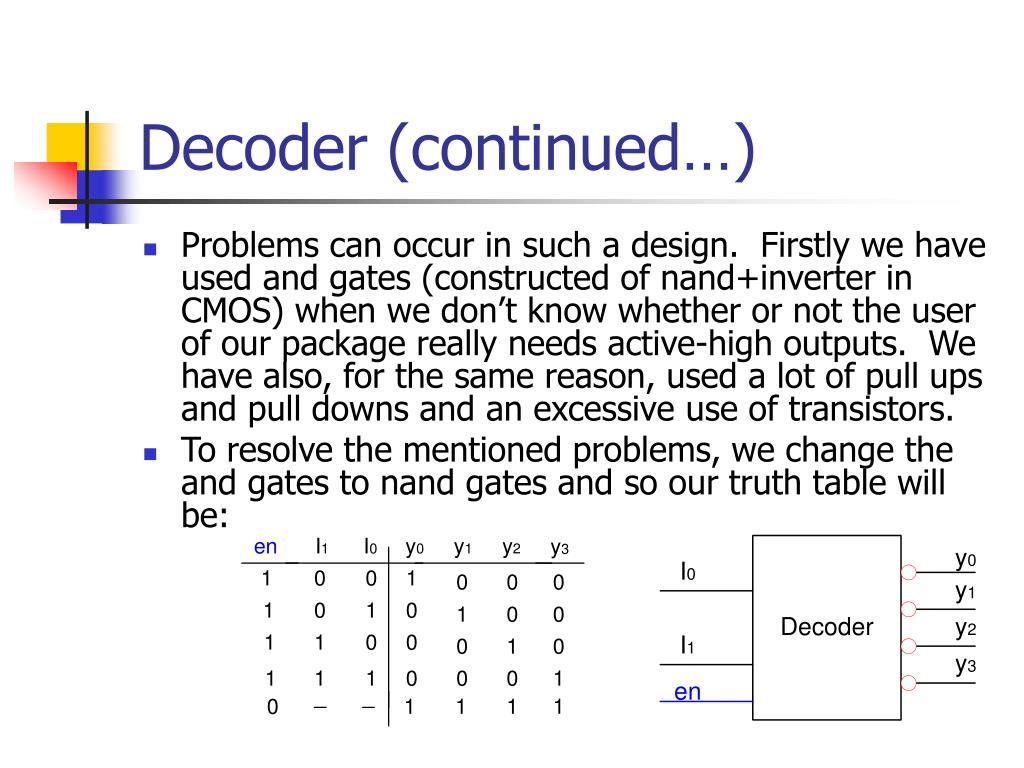 Decoder (continued…) • Problems can occur in such a design. Firstly we have used and gates (constructed of nand+inverter in CMOS) when we don’t know whether or not the user of our package really needs active-high outputs. We have also, for the same reason, used a lot of pull ups and pull downs and an excessive use of transistors. • To resolve the mentioned problems, we change the and gates to nand gates and so our truth table will be: