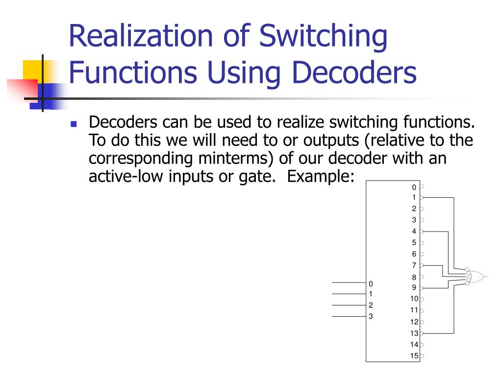 Realization of Switching Functions Using Decoders • Decoders can be used to realize switching functions. To do this we will need to or outputs (relative to the corresponding minterms) of our decoder with an active-low inputs or gate. Example:
