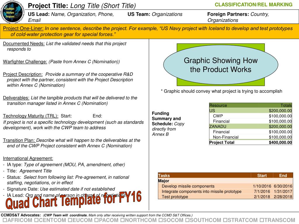 Project Title: Long Title (Short Title) CLASSIFICATION/REL MARKING Graphic Showing How the Product Works US Lead: Name, Organization, Phone, Email US Team:Organizations Foreign Partners: Country, Organizations Project One-Liner:In one sentence, describe the project. For example, “US Navy project with Iceland to develop and test prototypes of cold-water protection gear for special forces.” Documented Needs:List the validated needs that this project responds to Warfighter Challenge:(Paste from Annex C (Nomination)) Project Description:Provide a summary of the cooperative R&D project with the partner, consistent with the Project Description within Annex C (Nomination) Deliverables:List the tangible products that will be delivered to the transition manager listed in Annex C (Nomination) Technology Maturity (TRL): Start: End: If project is not a specific technology development (such as standards development), work with the CWP team to address Transition Plan: Describe what will happen to the deliverables at the end of the CWP Project consistent with Annex C (Nomination) International Agreement: • IA type: Type of agreement (MOU, PA, amendment, other) • Title: Agreement Title • Status: Select from following list: Pre-agreement, in national staffing, negotiations, or in effect • Signature Date: Use estimated date if not established • IA Lead: Org and name of person in charge of negotiations * Graphic should convey what project is trying to accomplish Funding Summary and Schedule: Copy directly from Annex B Quad Chart Template for FY16 CCMDS&T Advocates: (CWP Team will coordinate. Mark only after receiving written support from the CCMD S&T Offices.) AFRICOM CENTCOM EUCOM PACOM NORTHCOM SOCOM SOUTHCOM STRATCOM TRANSCOM