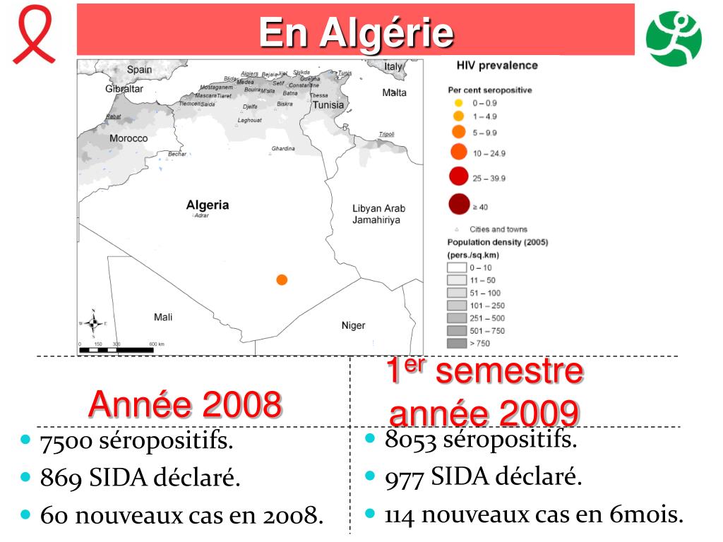 Année 2008 En Algérie 1er semestre année 2009 • 8053 séropositifs. • 977 SIDA déclaré. • 114 nouveaux cas en 6mois. • 7500 séropositifs. • 869 SIDA déclaré. • 60 nouveaux cas en 2008.