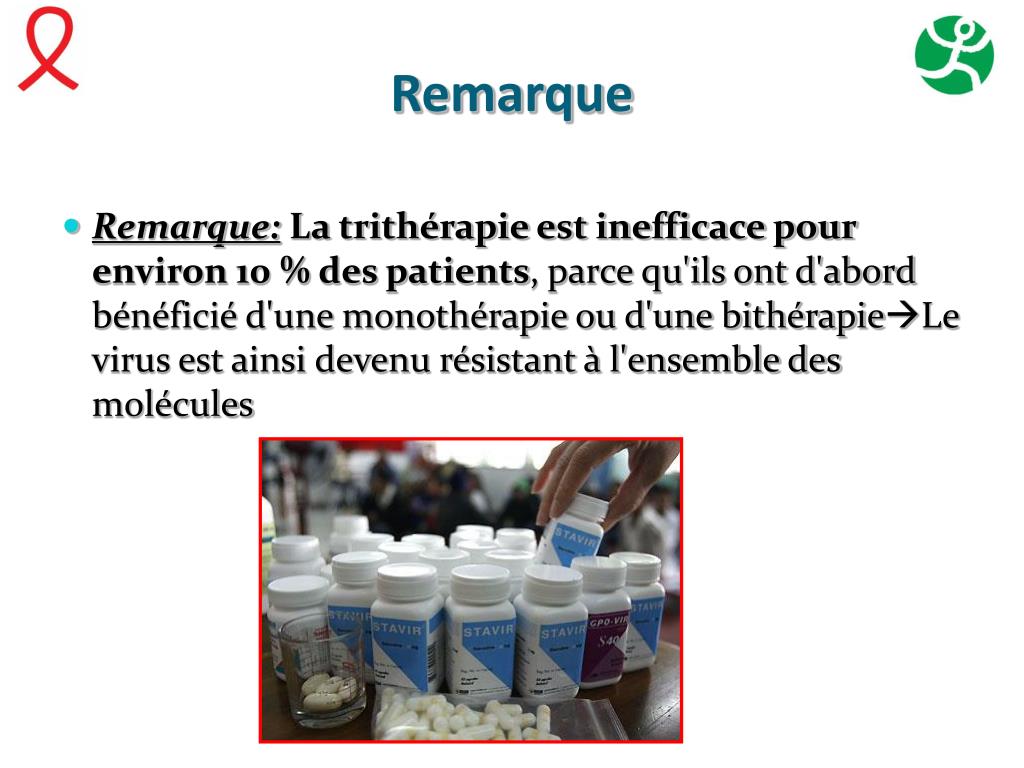 Remarque Remarque: La trithérapie est inefficace pour environ 10 % des patients, parce qu'ils ont d'abord bénéficié d'une monothérapie ou d'une bithérapieLe virus est ainsi devenu résistant à l'ensemble des molécules
