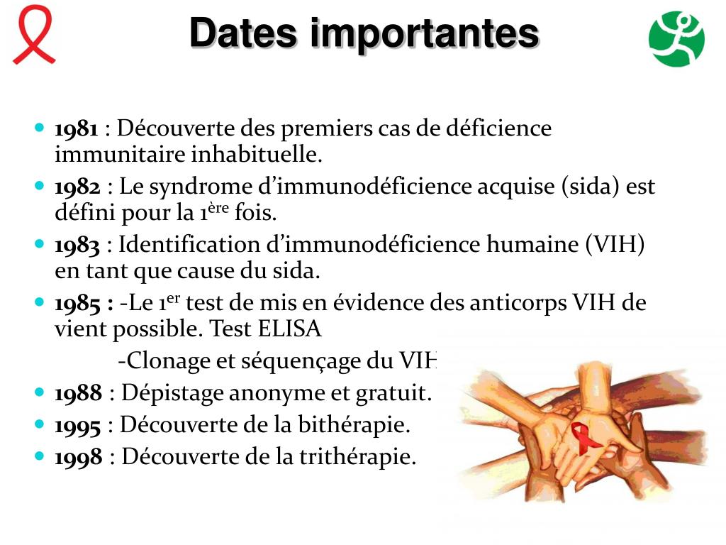 Dates importantes 1981 : Découverte des premiers cas de déficience immunitaire inhabituelle. 1982 : Le syndrome d’immunodéficience acquise (sida) est défini pour la 1ère fois. 1983 : Identification d’immunodéficience humaine (VIH) en tant que cause du sida. 1985 : -Le 1er test de mis en évidence des anticorps VIH de vient possible. Test ELISA -Clonage et séquençage du VIH. 1988 : Dépistage anonyme et gratuit. 1995 : Découverte de la bithérapie. 1998 : Découverte de la trithérapie.