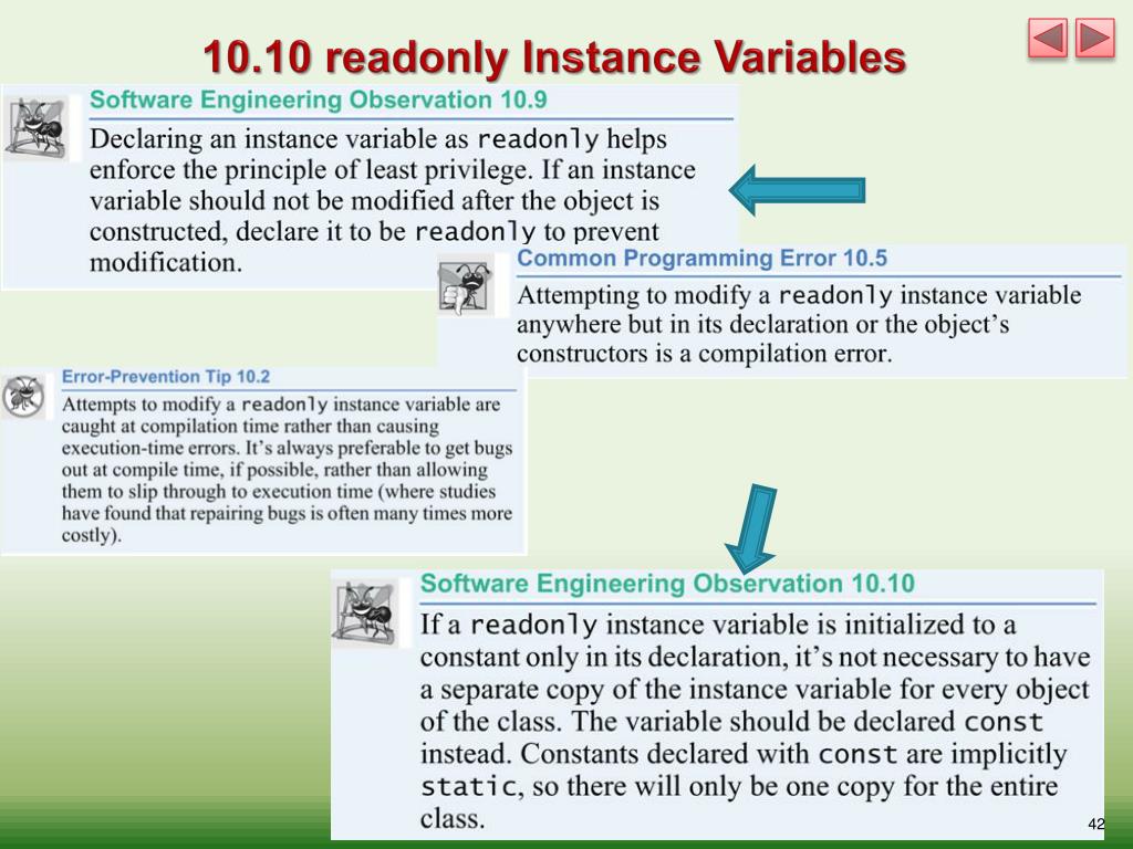 What is the difference between constand static readonly? • static readonly field is set at run time, and can thus be modified by the containing class • the value of a const field is set to a compile time constant. • In the staticreadonlycase, the containing class is allowed to modify it only in the variable declaration (through a variable initializer) in the static constructor (instance constructors, if it's not static) • staticreadonlyis typically used if the type of the field is not allowed in a const declaration, or when the value is not known at compile time. • Instancereadonly fields are also allowed. • Remember that for reference types, in both cases (static and instance) the readonly modifier only prevents you from assigning a new reference to the field. It specifically does not make immutable the object pointed to by the reference.