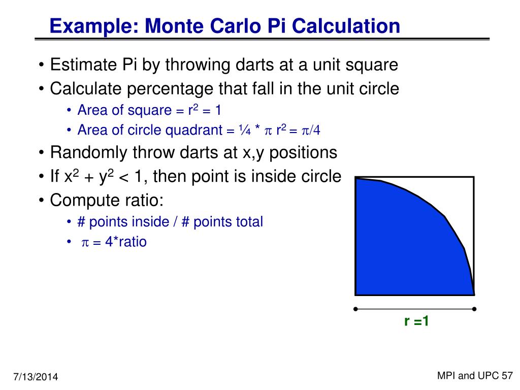 r =1 Example: Monte Carlo Pi Calculation • Estimate Pi by throwing darts at a unit square • Calculate percentage that fall in the unit circle • Area of square = r2 = 1 • Area of circle quadrant = ¼ * p r2 = p/4 • Randomly throw darts at x,y positions • If x2 + y2 < 1, then point is inside circle • Compute ratio: • # points inside / # points total • p = 4*ratio