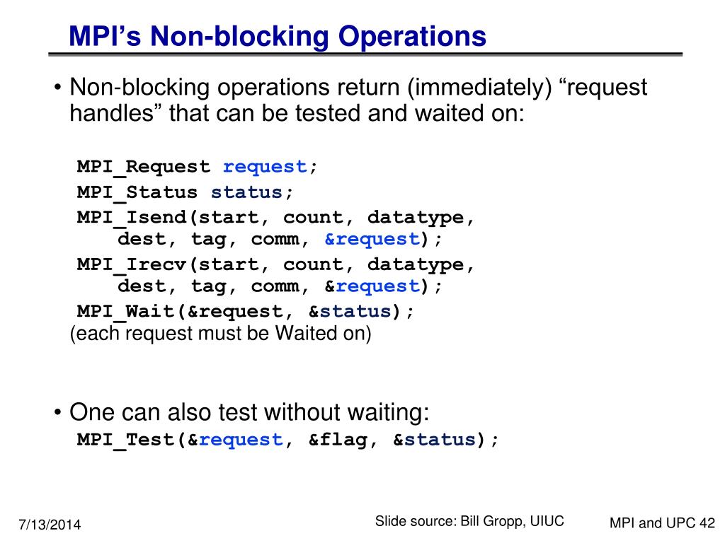MPI’s Non-blocking Operations • Non-blocking operations return (immediately) “request handles” that can be tested and waited on: MPI_Request request; MPI_Status status; MPI_Isend(start, count, datatype, dest, tag, comm, &request); MPI_Irecv(start, count, datatype, dest, tag, comm, &request); MPI_Wait(&request, &status);(each request must be Waited on) • One canalso test without waiting: MPI_Test(&request, &flag, &status); Slide source: Bill Gropp, UIUC