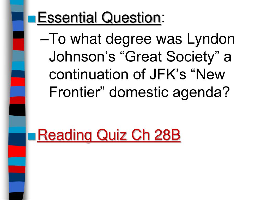 Essential Question: • To what degree was Lyndon Johnson’s “Great Society” a continuation of JFK’s “New Frontier” domestic agenda? • Reading Quiz Ch 28B