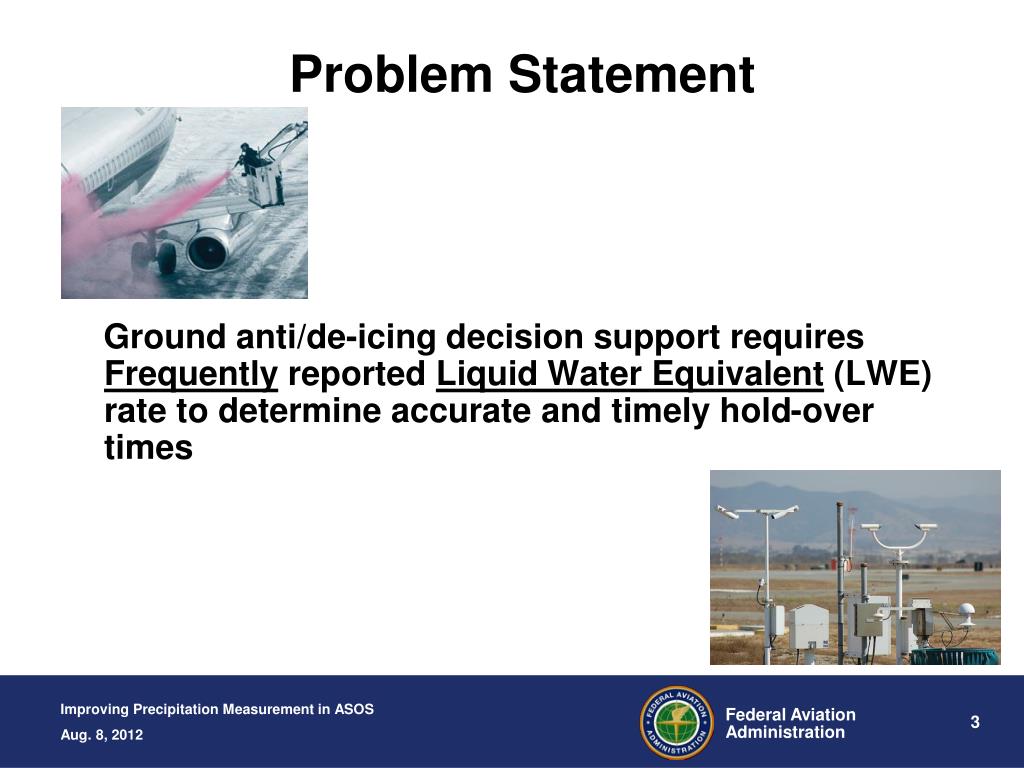 Improving Precipitation Measurement in ASOS in Support of Aircraft Ground Deicing. Purpose. Provide an effective airport weather observation system to support ground anti/de-icing decision making. Problem Statement.