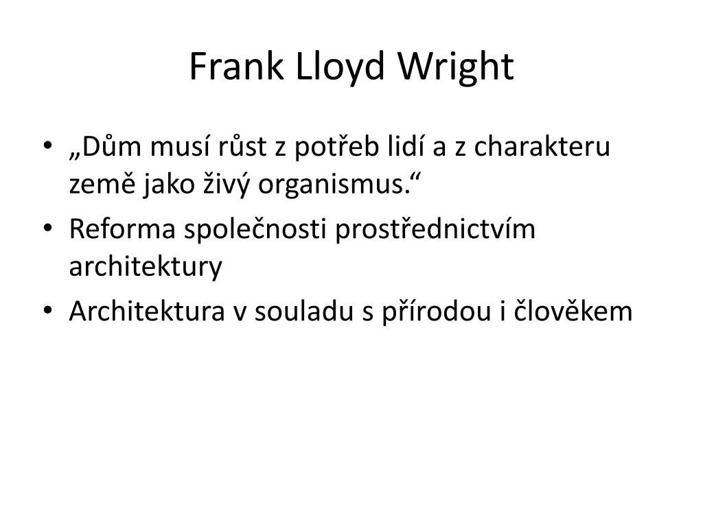 Frank LloydWright • „Dům musí růst z potřeb lidí a z charakteru země jako živý organismus.“ • Reforma společnosti prostřednictvím architektury • Architektura v souladu s přírodou i člověkem