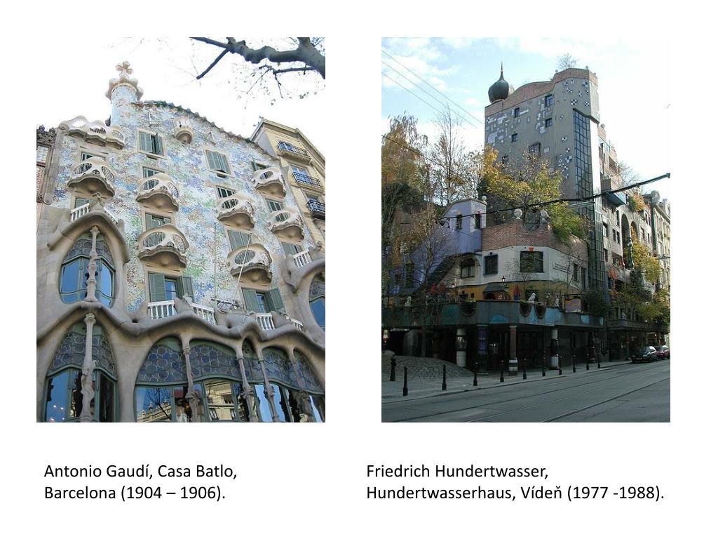 Antonio Gaudí, Casa Batlo, Barcelona (1904 – 1906). Friedrich Hundertwasser, Hundertwasserhaus, Vídeň (1977 -1988).