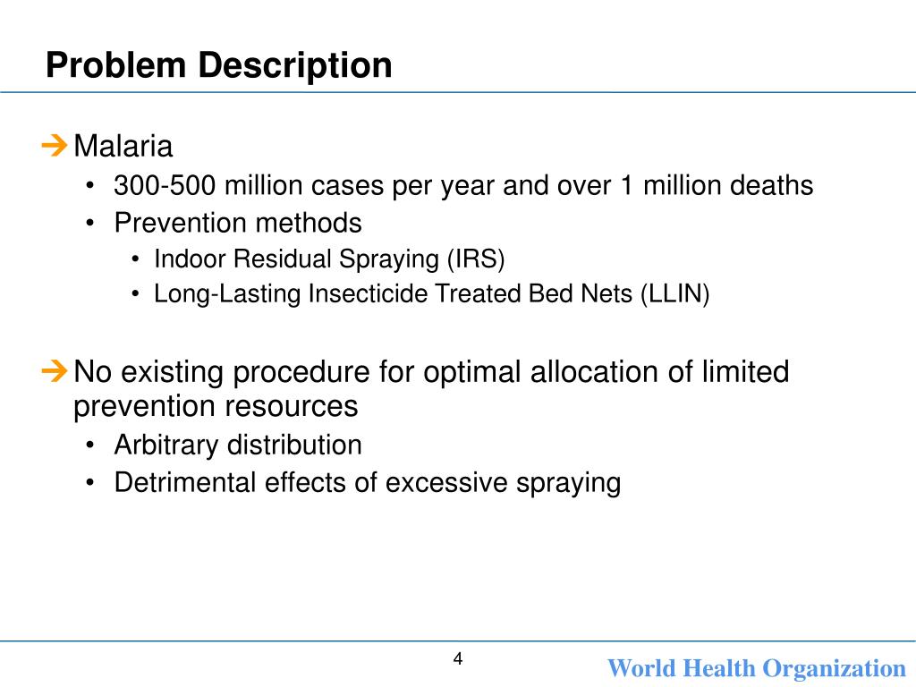 Problem Description • Malaria • 300-500 million cases per year and over 1 million deaths • Prevention methods • Indoor Residual Spraying (IRS) • Long-Lasting Insecticide Treated Bed Nets (LLIN) • No existing procedure for optimal allocation of limited prevention resources • Arbitrary distribution • Detrimental effects of excessive spraying