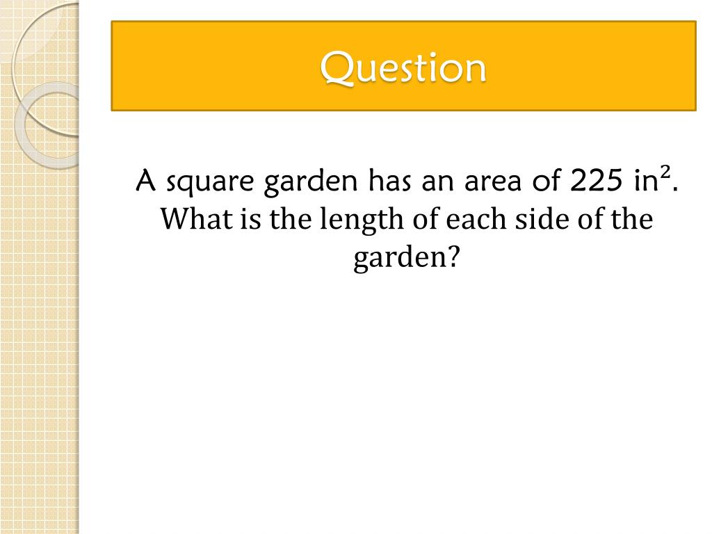 Question A square garden has an area of 225 in². What is the length of each side of the garden?
