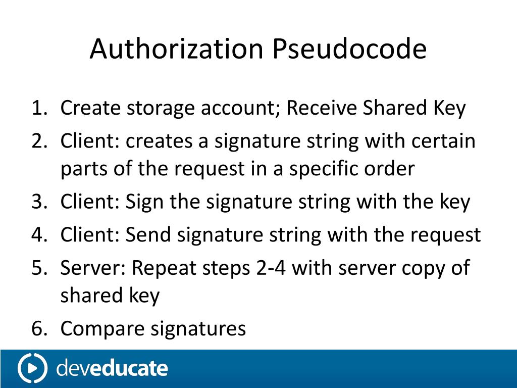 Authorization Pseudocode • Create storage account; Receive Shared Key • Client: creates a signature string with certain parts of the request in a specific order • Client: Sign the signature string with the key • Client: Send signature string with the request • Server: Repeat steps 2-4 with server copy of shared key • Compare signatures