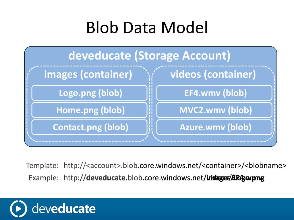 Blob Data Model deveducate (Storage Account) images (container) videos (container) Logo.png (blob) EF4.wmv (blob) Home.png (blob) MVC2.wmv (blob) Contact.png (blob) Azure.wmv (blob) • Template: • http://<account>.blob.core.windows.net/<container>/<blobname> • Example: • http://deveducate.blob.core.windows.net/images/Logo.png • http://deveducate.blob.core.windows.net/videos/EF4.wmv