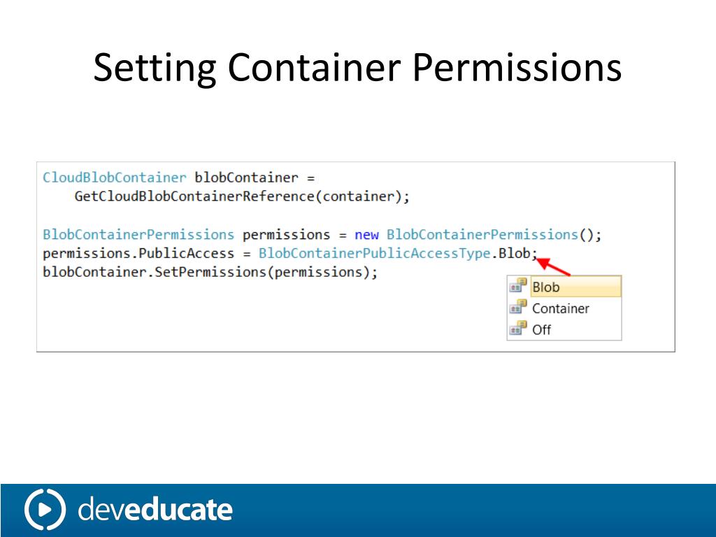 Root Containers • Default container for your account • A BLOB can be addressed in a root container without referencing the root container name • The root container must be created (there is no root container by default) • Create by adding a container named $root http://deveducate.blob.core.windows.net/$root/EF4.png http://deveducate.blob.core.windows.net/EF4.png