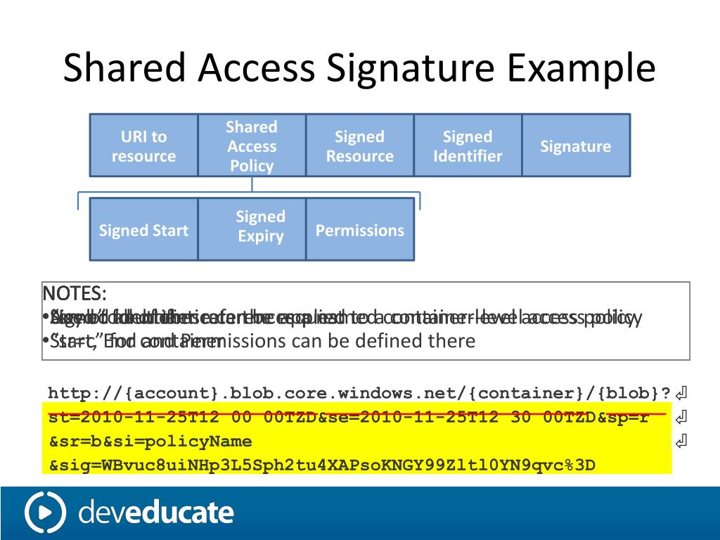 Example Shared Access Signature on Blob Shared Access Signature – with container-level access policy Shared Access Signature on Container