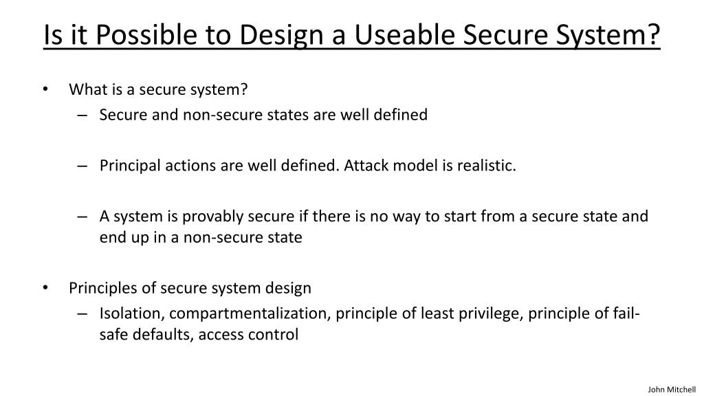 Is it Possible to Design a Useable Secure System? • What is a secure system? • Secure and non-secure states are well defined • Principal actions are well defined. Attack model is realistic. • A system is provably secure if there is no way to start from a secure state and end up in a non-secure state • Principles of secure system design • Isolation, compartmentalization, principle of least privilege, principle of fail-safe defaults, access control