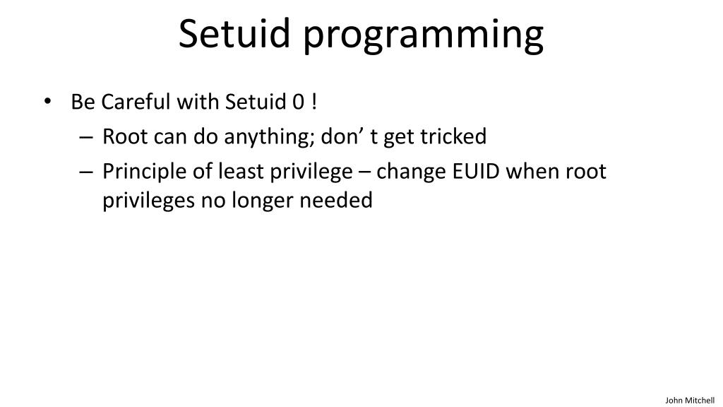 Setuid programming • Be Careful with Setuid 0 ! • Root can do anything; don’ t get tricked • Principle of least privilege – change EUID when root privileges no longer needed