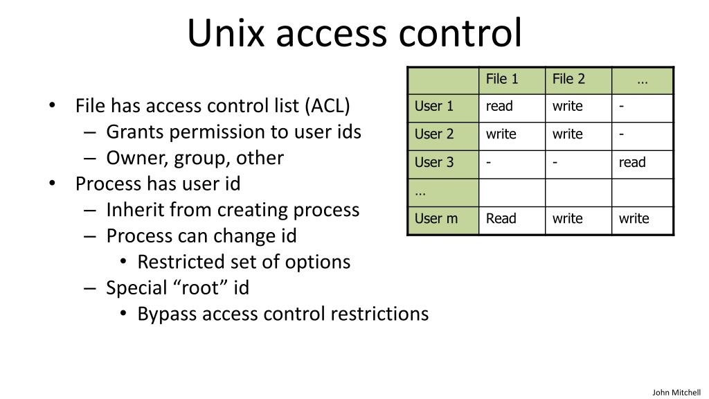 Unix file access control list • Each file has owner and group • Permissions set by owner • Read, write, execute • Owner, group, other • Represented by vector of four octal values • Only owner, root can change permissions • This privilege cannot be delegated or shared • Setid bits – Discuss in a few slides setid - rwx rwx rwx ownr grp othr