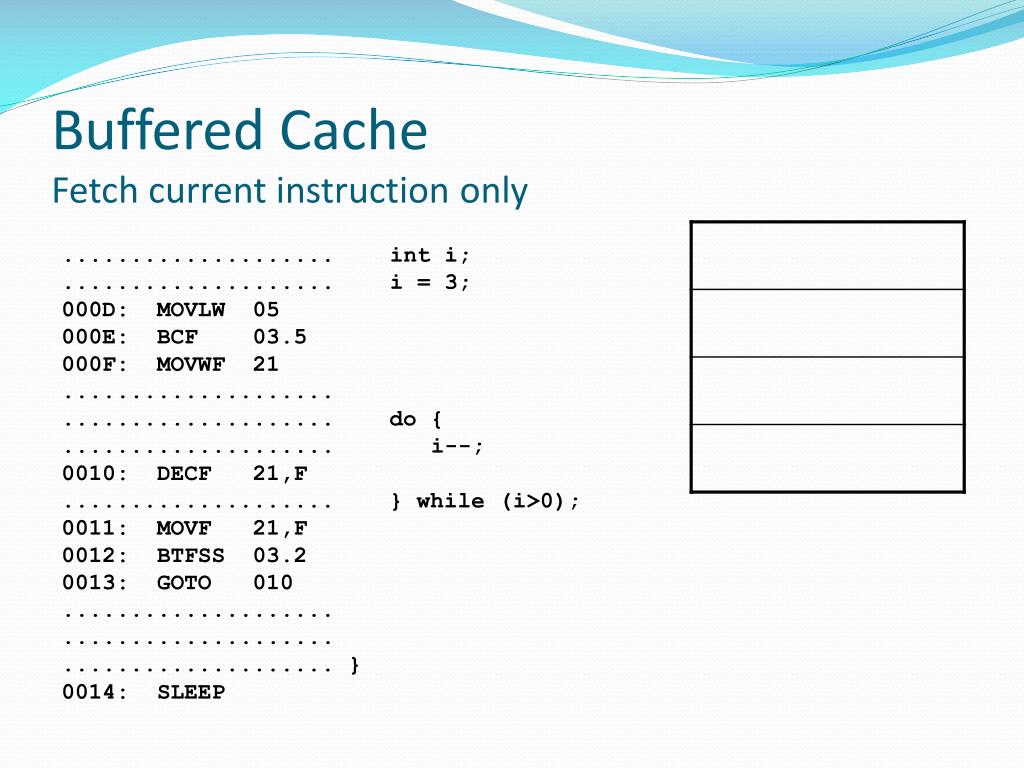 Buffered CacheFetch current instruction only .................... inti; .................... i = 3; 000D: MOVLW 05 000E: BCF 03.5 000F: MOVWF 21 .................... .................... do { .................... i--; 0010: DECF 21,F .................... } while (i>0); 0011: MOVF 21,F 0012: BTFSS 03.2 0013: GOTO 010 .................... .................... .................... } 0014: SLEEP