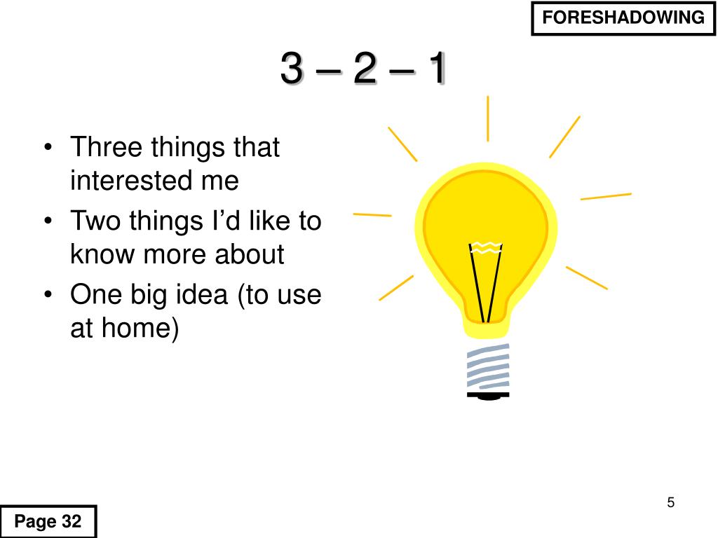 FORESHADOWING 3 – 2 – 1 • Three things that interested me • Two things I’d like to know more about • One big idea (to use at home) Page 32