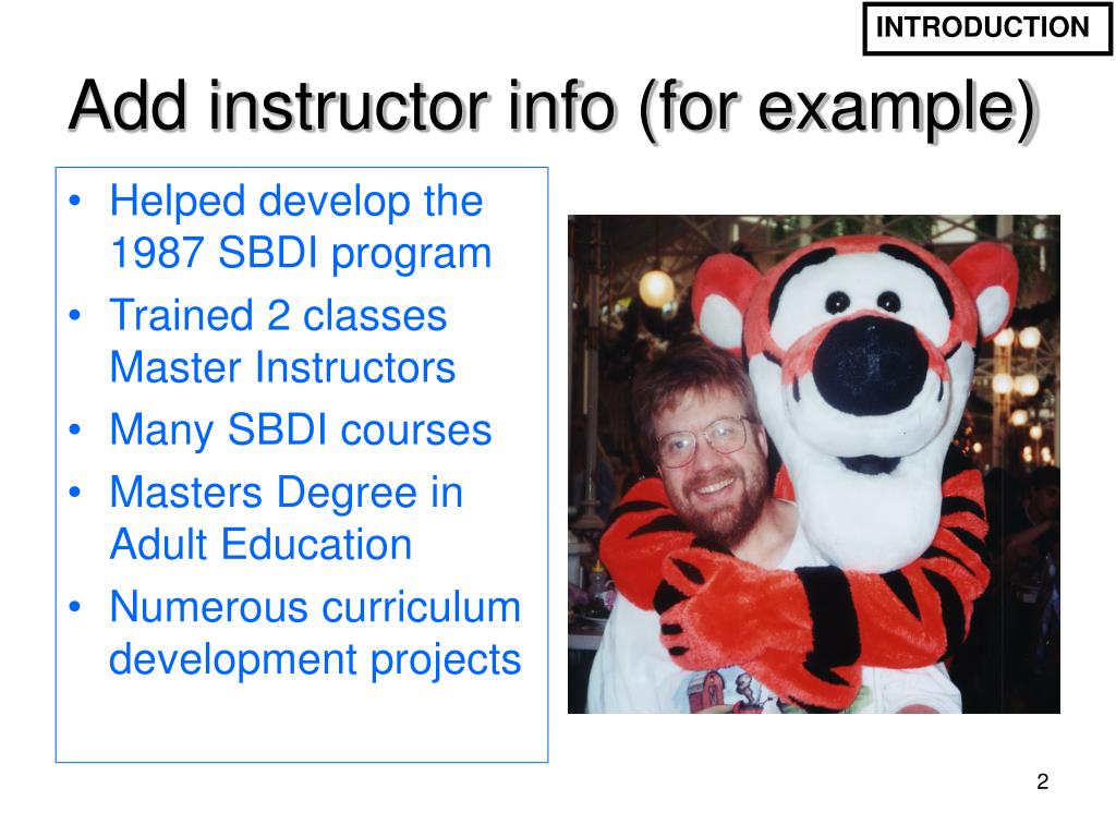 INTRODUCTION Add instructor info (for example) • Helped develop the 1987 SBDI program • Trained 2 classes Master Instructors • Many SBDI courses • Masters Degree in Adult Education • Numerous curriculum development projects