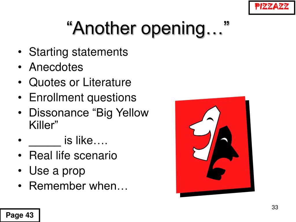 Starting statements Anecdotes Quotes or Literature Enrollment questions Dissonance “Big Yellow Killer” _____ is like…. Real life scenario Use a prop Remember when… PIZZAZZ “Another opening…” Page 43