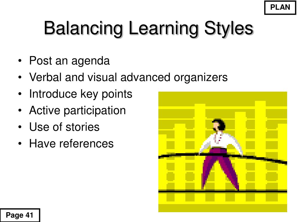 PLAN Balancing Learning Styles • Post an agenda • Verbal and visual advanced organizers • Introduce key points • Active participation • Use of stories • Have references Page 41