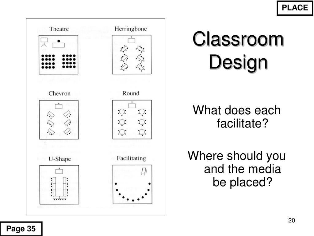 PLACE Classroom Design What does each facilitate? Where should you and the media be placed? Page 35