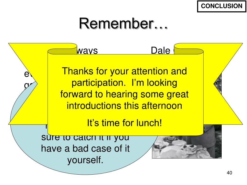 There are always three speeches, for every one you actually gave: The one you practiced…the one you gave…and the one you wish you gave. Dale Carnegie Thanks for your attention and participation. I’m looking forward to hearing some great introductions this afternoon It’s time for lunch! CONCLUSION Remember… Interest, be it remembered, is contagious. Your hearers are almost sure to catch it if you have a bad case of it yourself.