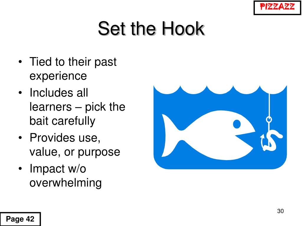 PIZZAZZ Set the Hook • Tied to their past experience • Includes all learners – pick the bait carefully • Provides use, value, or purpose • Impact w/o overwhelming Page 42
