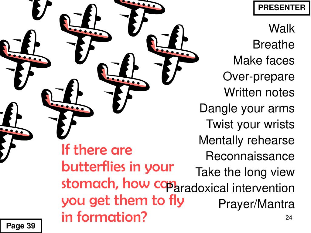 If there are butterflies in your stomach, how can you get them to fly in formation? Walk Breathe Make faces Over-prepare Written notes Dangle your arms Twist your wrists Mentally rehearse Reconnaissance Take the long view Paradoxical intervention Prayer/Mantra PRESENTER Page 39