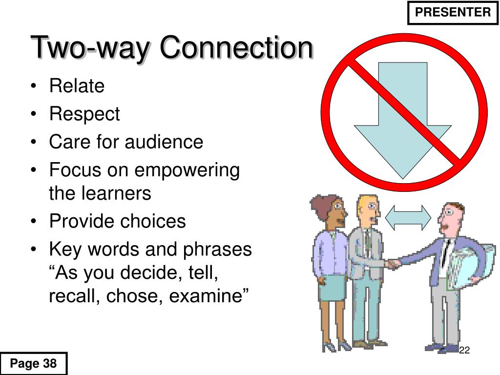 PRESENTER Two-way Connection • Relate • Respect • Care for audience • Focus on empowering the learners • Provide choices • Key words and phrases “As you decide, tell, recall, chose, examine” Page 38