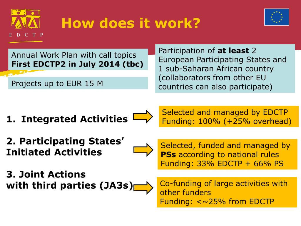 How does it work? Annual Work Plan with call topics Thematic Stakeholder meetings (5 in 2013); Scientific advisory Committee; Commissioned studies, other input First EDCTP2 work plan in August 2014 (tbc) • Calls for proposals for Integrated Projects (Selected, funded and managed by EDCTP Secretariat) • National calls for proposals • (Selected, funded and managed by PSs according to national rules)