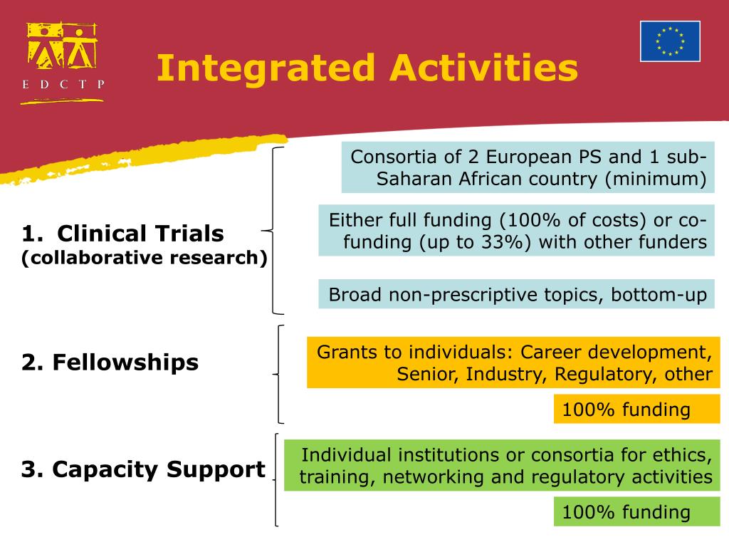 Integrated Activities Consortia of 2 European PS and 1 sub-Saharan African country (minimum) Either full funding (100% of costs) or co-funding (up to 33%) with other funders • Clinical Trials • (collaborative research) • 2. Fellowships • 3. Capacity Support Broad non-prescriptive topics, bottom-up • Grants to individuals: Career development, Senior, Industry, Regulatory, other 100% funding • Individual institutions or consortia for ethics, training, networking and regulatory activities 100% funding