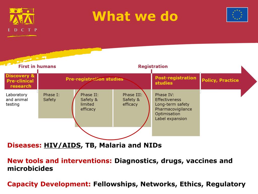 What we do Diseases: HIV/AIDS, TB, Malaria and NIDs New tools and interventions: Diagnostics, drugs, vaccines and microbicides Capacity Development: Fellowships, Networks, Ethics, Regulatory