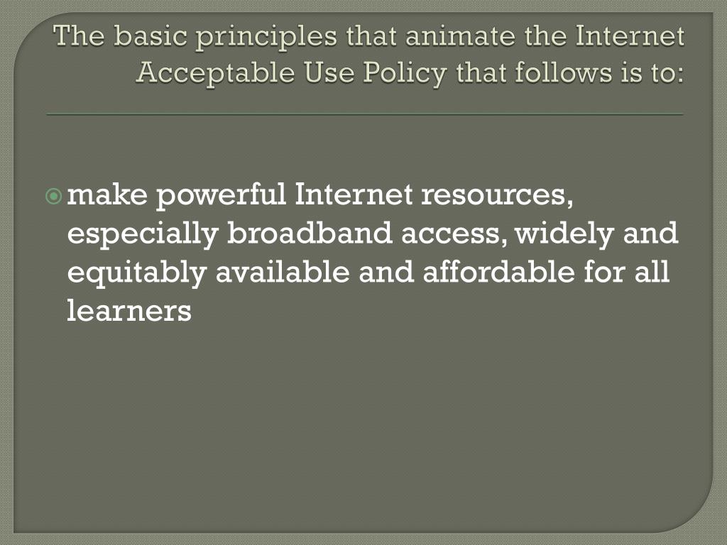 Thebasicprinciplesthatanimatethe Internet AcceptableUsePolicythatfollows is to: makepowerful Internet resources, especiallybroadbandaccess, widelyandequitablyavailableandaffordableforalllearners