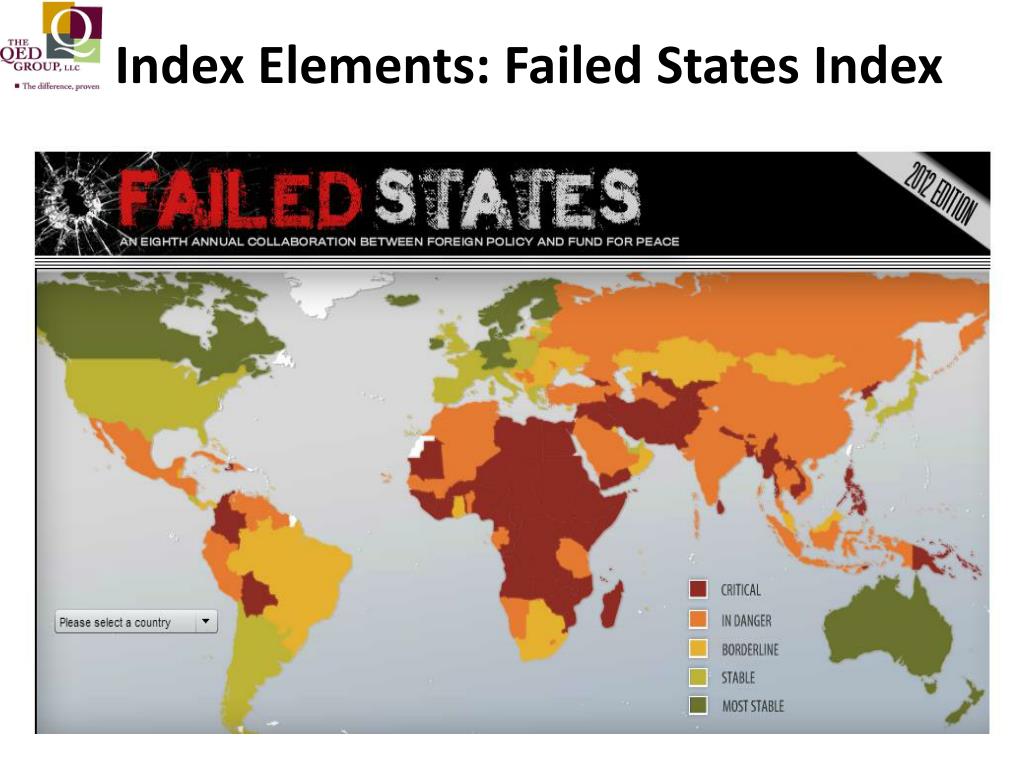 Overview • USG Peace and Security Indicators – Program Level (Where is the impact?) • Peace and Security Index – Country Level (Where is the attribution?) • Need to focus on regions, or sub-regions of need • Two evaluations conducted for USAID in unstable regions of Africa (2010-2013) provide some lessons for future exploration