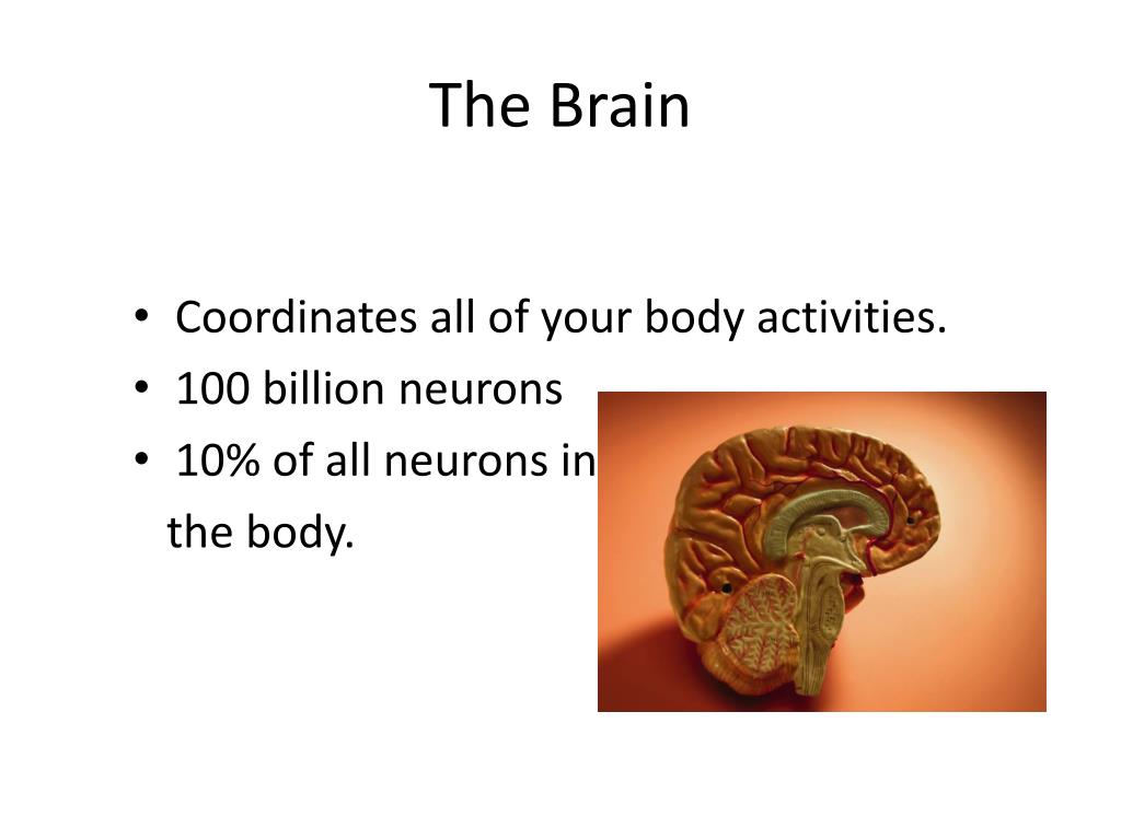The Brain • Coordinates all of your body activities. • 100 billion neurons • 10% of all neurons in the body.