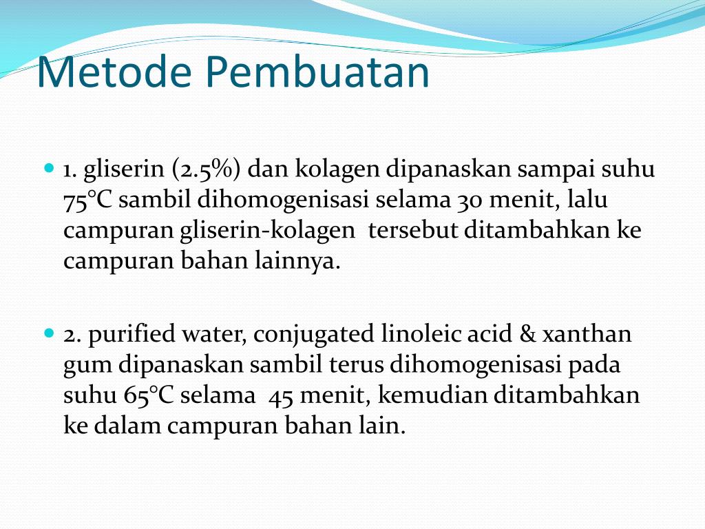 Metode Pembuatan • 1. gliserin (2.5%) dan kolagen dipanaskan sampai suhu 75°C sambil dihomogenisasi selama 30 menit, lalu campuran gliserin-kolagen tersebut ditambahkan ke campuran bahan lainnya. • 2. purified water, conjugated linoleic acid & xanthan gum dipanaskan sambil terus dihomogenisasi pada suhu 65°C selama 45 menit, kemudian ditambahkan ke dalam campuran bahan lain.