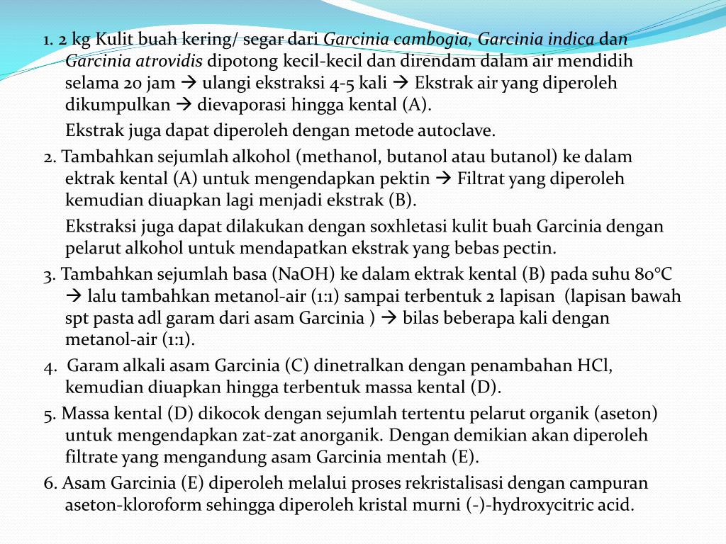 1. 2 kg Kulit buah kering/ segar dari Garcinia cambogia, Garcinia indica dan Garcinia atrovidis dipotong kecil-kecil dan direndam dalam air mendidih selama 20 jam ulangi ekstraksi 4-5 kali Ekstrak air yang diperoleh dikumpulkan dievaporasi hingga kental (A). Ekstrak juga dapat diperoleh dengan metode autoclave. 2. Tambahkan sejumlah alkohol (methanol, butanol atau butanol) ke dalam ektrak kental (A) untuk mengendapkan pektin Filtrat yang diperoleh kemudian diuapkan lagi menjadi ekstrak (B). Ekstraksi juga dapat dilakukan dengan soxhletasi kulit buah Garcinia dengan pelarut alkohol untuk mendapatkan ekstrak yang bebas pectin. 3. Tambahkan sejumlah basa (NaOH) ke dalam ektrak kental (B) pada suhu 80°C lalu tambahkan metanol-air (1:1) sampai terbentuk 2 lapisan (lapisan bawah spt pasta adl garam dari asam Garcinia ) bilas beberapa kali dengan metanol-air (1:1). 4. Garam alkali asam Garcinia (C) dinetralkan dengan penambahan HCl, kemudian diuapkan hingga terbentuk massa kental (D). 5. Massa kental (D) dikocok dengan sejumlah tertentu pelarut organik (aseton) untuk mengendapkan zat-zat anorganik. Dengan demikian akan diperoleh filtrate yang mengandung asam Garcinia mentah (E). 6. Asam Garcinia (E) diperoleh melalui proses rekristalisasi dengan campuran aseton-kloroform sehingga diperoleh kristal murni (-)-hydroxycitric acid.