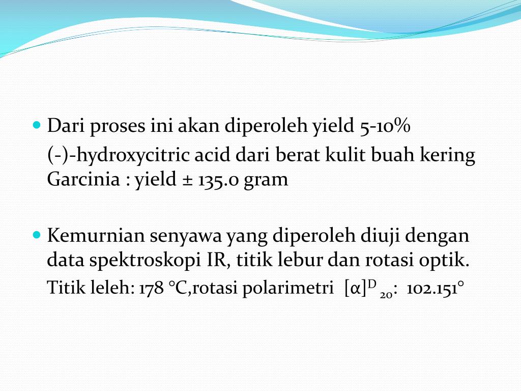 Dari proses ini akan diperoleh yield 5-10% (-)-hydroxycitric acid dari berat kulit buah kering Garcinia : yield ± 135.0 gram • Kemurnian senyawa yang diperoleh diuji dengan data spektroskopi IR, titik lebur dan rotasi optik. Titik leleh: 178 °C,rotasi polarimetri [α]D 20: 102.151°