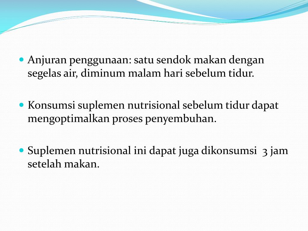 Anjuran penggunaan: satu sendok makan dengan segelas air, diminum malam hari sebelum tidur. • Konsumsi suplemen nutrisional sebelum tidur dapat mengoptimalkan proses penyembuhan. • Suplemen nutrisional ini dapat juga dikonsumsi 3 jam setelah makan.