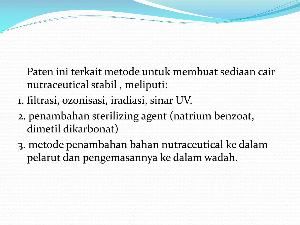 Paten ini terkait metode untuk membuat sediaan cair nutraceutical stabil , meliputi: 1. filtrasi, ozonisasi, iradiasi, sinar UV. 2. penambahan sterilizing agent (natrium benzoat, dimetil dikarbonat) 3. metode penambahan bahan nutraceutical ke dalam pelarut dan pengemasannya ke dalam wadah.