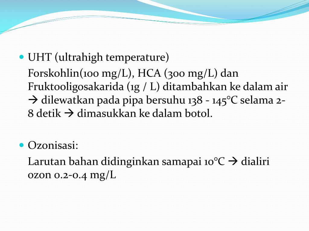 UHT (ultrahigh temperature) Forskohlin(100 mg/L), HCA (300 mg/L) dan Fruktooligosakarida (1g / L) ditambahkan ke dalam air dilewatkan pada pipa bersuhu 138 - 145°C selama 2-8 detik dimasukkan ke dalam botol. • Ozonisasi: Larutan bahan didinginkan samapai 10°C dialiri ozon 0.2-0.4 mg/L