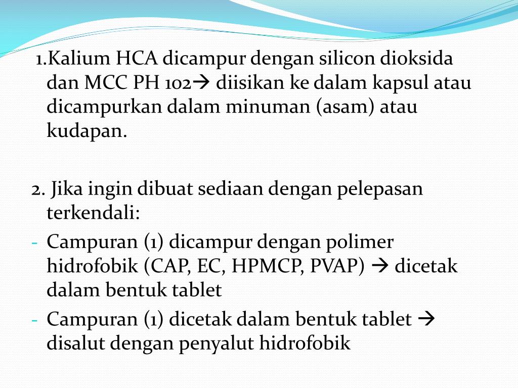 1.Kalium HCA dicampur dengan silicon dioksida dan MCC PH 102 diisikan ke dalam kapsul atau dicampurkan dalam minuman (asam) atau kudapan. 2. Jika ingin dibuat sediaan dengan pelepasan terkendali: • Campuran (1) dicampur dengan polimer hidrofobik (CAP, EC, HPMCP, PVAP) dicetak dalam bentuk tablet • Campuran (1) dicetakdalambentuk tablet disalutdenganpenyaluthidrofobik